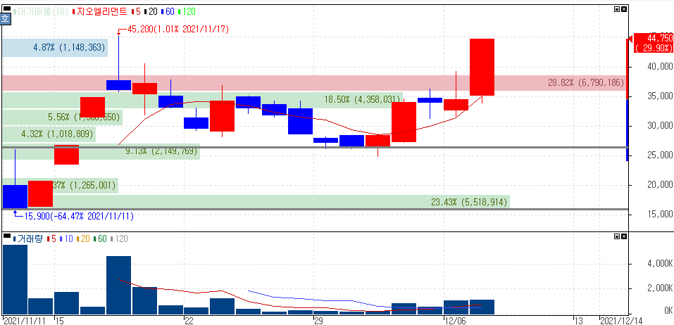 메모리 가격 반등 및 서버 수요 긍정적 전망 등에 반도체 관련주 상승 속 상한가를 기록한 지오엘리먼트 주가 입니다.