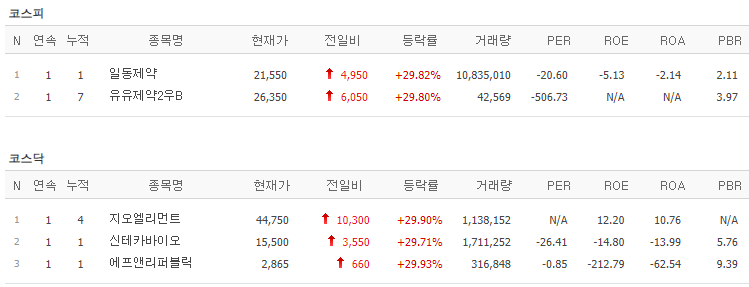 코스피에서는 일동제약, 유유제약2우B가 상한가를 기록했고, 코스닥에서는 지오엘리먼트, 신테카바이오, 에프앤리퍼블릭이 상한가를 기록했습니다.