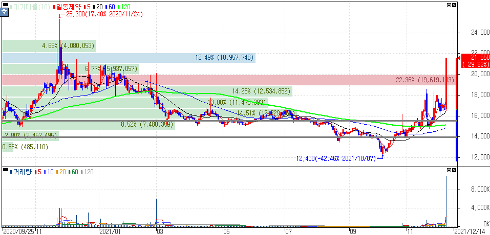 일본 시오노기제약과 공동개발 중인 경구용 코로나19 치료제, 내년 4월 출시 예정 소식에 상한가를 기록한 일동제약 주가 입니다.