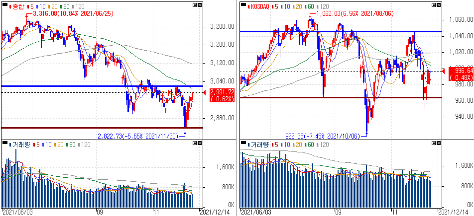 금일 코스피 지수는 +0.62% 상승한 2,991.72에 마감하였고, 코스닥 지수는 +0.48% 상승한 996.64에 마감하였습니다. 오미크론 경계감이 풀리면서 상승을 보여주었습니다.