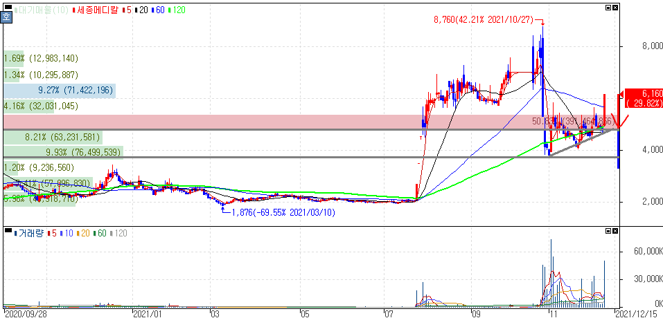 경구용 치료제에다가 변이 바이러스 치료 효과까지 펜더믹 상황에 긍정적인 소식이 아닐 수 없는데요. 세종메디칼 경우 지난번 급락을 보였던 종목으로 주가 변동성이 크다는 점도 참고 할 수 있습니다. 상한가를 기록한 세종메디칼 외 한국파마 +13.68%, 골드퍼시픽 +11.79%이 있습니다.