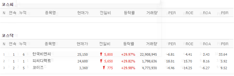 코스피에서는 상한가 종목이 없었고, 코스닥에서는 한국비엔씨, 피씨디렉트, 코이즈가 상한가를 기록했습니다.