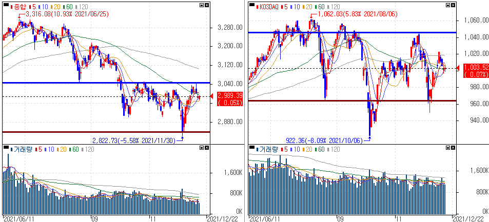 금일 코스피 지수는 +0.05% 상승한 2,989.39에 마감하였고, 코스닥 지수는 +0.07% 상승한 1,003.52에 마감하였습니다. FOMC 결과 발표를 앞두고 혼조세를 보였습니다.