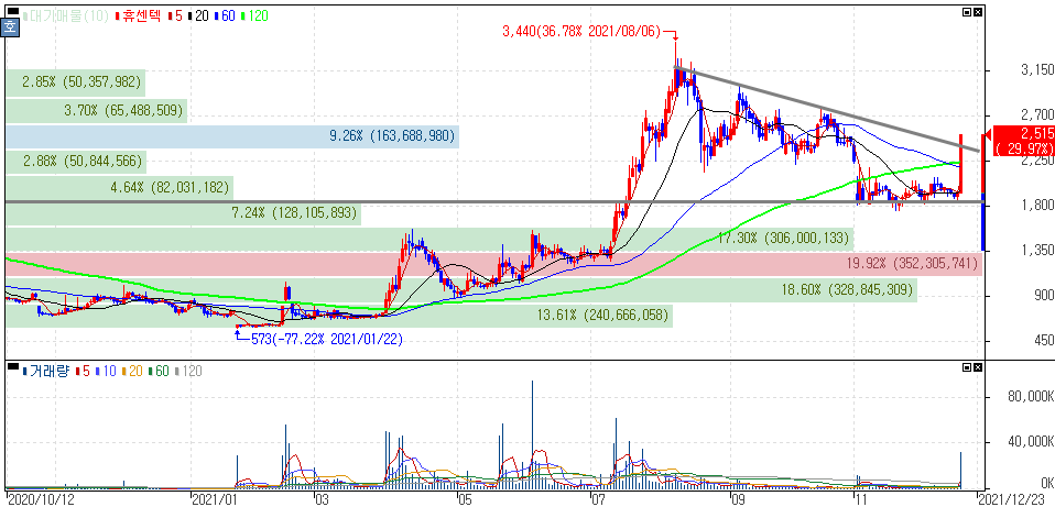 포스코그룹 관련 종목들은 지난 아르헨티나 염호의 높은 가치에 대한 소식이 나왔을 때 크게 상승을 보였었는데요. 지난 5월에서 11월 사이 거기서 두배가 더 오르면서 올해에만 240% 상승해 지난 5년 중 최고치를 나타내고 있죠. 아르헨티나 염호와 관련해서는 포스코엠텍(+15.66%) 외에도 포스코에 수산화리튬설비를 공급하는 웰크론한텍(+4.19%)이나 관계사 리튬플러스가 순도 99.99% 수산화리튬 개발에 성공해 국내 최초 상용화를 앞두고 있다는 휴센텍(상한가)이 부각을 받았습니다.