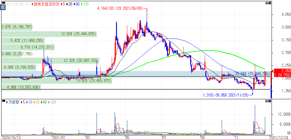 국내 한파특보, 대설주의보에 겨울옷 의류 업체 부각으로 상한가를 기록한 엠에프엠코리아 주가 입니다.
