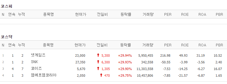 코스피에서는 상한가 종목이 없었고, 코스닥에서는 넷게임즈, SNK, 코이즈, 엠에프엠코리아가 상한가를 기록했습니다.