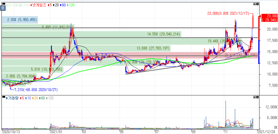 넷게임즈·넥슨지티 합병 소식에 상한가를 기록한 넷게임즈 주가 입니다.