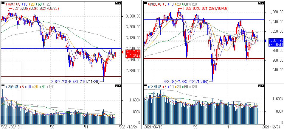 금일 코스피 지수는 +0.38% 상승한 3,017.69에 마감하였고, 코스닥 지수는 -0.65% 하락한 1,001.26에 마감하였습니다. 긴축에 대한 우려와 불확실성 해소에 대한 시각이 엇갈리면서 혼조세를 보였습니다.