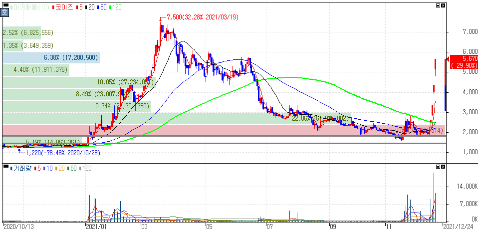 2차전지 양극재 첨가제 양산개발 본격 추진 모멘텀 지속으로 4거래일 연속 상한가를 기록한 코이즈 주가 입니다.