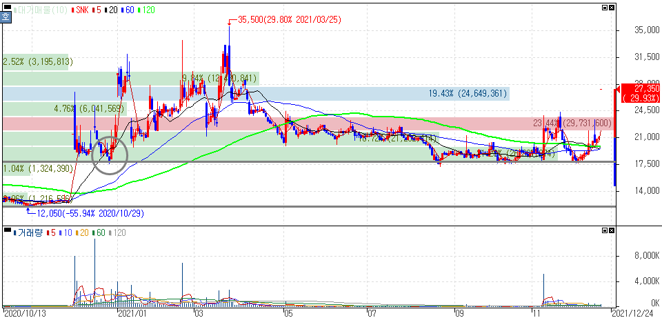 최대주주 Electronic Gaming Development Company, 자진 상장폐지 목적 동사 주식 공개매수 결정에 상한가를 기록한 SNK 주가 입니다.