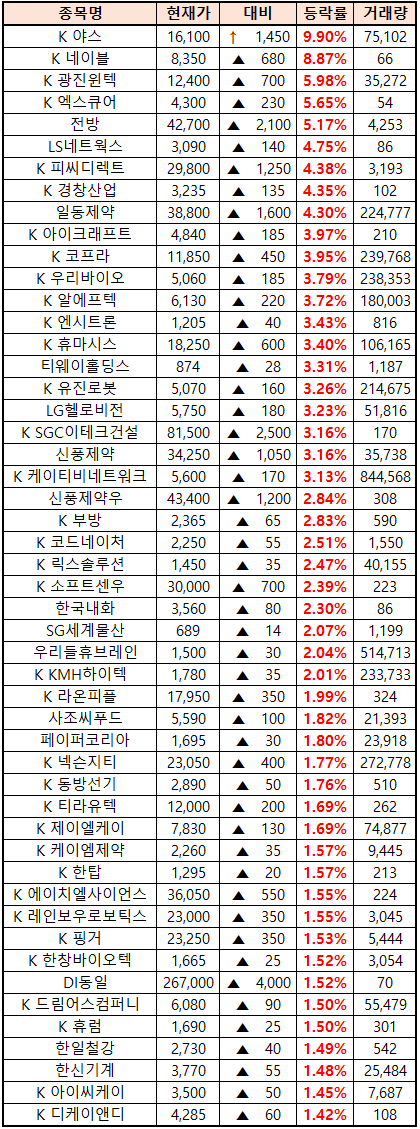(종목명 앞에 'K'는 코스닥 종목을 의미합니다.)