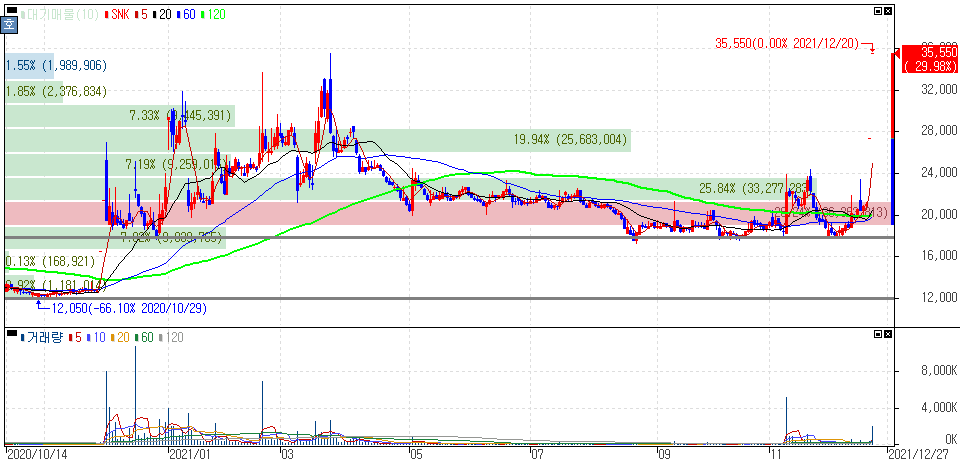 '킹 오브 파이터즈' 게임으로 유명한 SNK인데 최대주주 사우디아라비아의 왕세자 무함마드 빈살만 왕세자가 설립한 재단이 100% 지분을 보유하고 있는 EGDC라는 기업이죠. 최대주주 EGDC는 1주당 37,197원에 공개매수할 예정을 발표하면서 이틀 연속 상한가를 기록하고 있습니다.