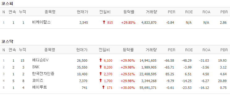 코스피에서는 비케이탑스가 상한가를 기록했고, 코스닥에서는 에디슨EV, SNK, 한국전자인증, 코이즈, 에이루트가 상한가를 기록했습니다.