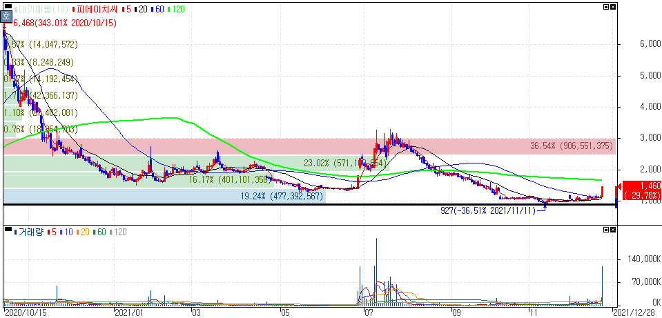 코로나19 진단키트 해외 허가 획득 소식에 상한가를 기록한 피에이치씨 주가 입니다.
