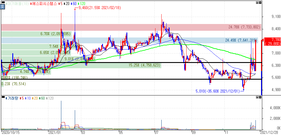 현대차와 64.54억원 규모 산업용 로봇 자동화 시스템 공급계약 체결 소식에 상한가를 기록한 에스피시스템스 주가 입니다.
