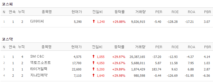 코스피에서는 디아이씨가 상한가를 기록했고, 코스닥에서는 SM C&C, 액토즈소프트, 타이거일렉, 지나인제약이 상한가를 기록했습니다.