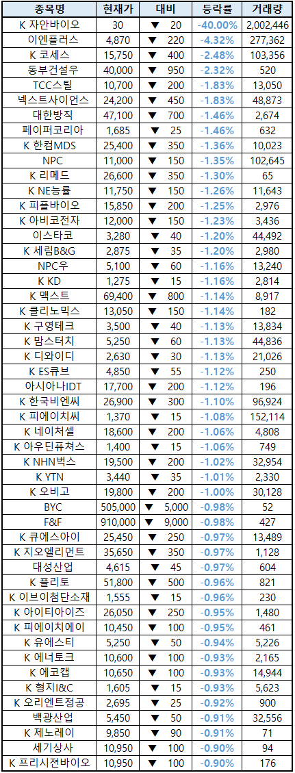 시간외 단일가매매 종가 종목 확인시 단순 급등주 등락률만 볼 것이 아니라, '거래량'에 따르는 거래대금도 판단하면서 보는 것이 중요합니다. (종목명 앞에 'K'는 코스닥 종목을 의미합니다.)