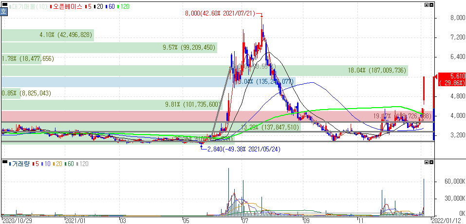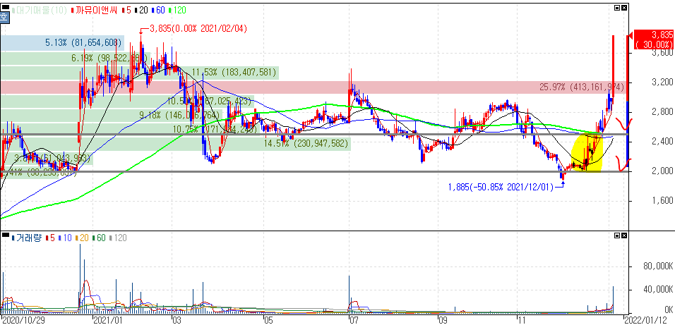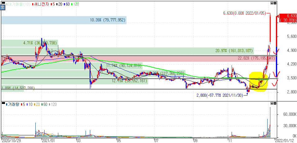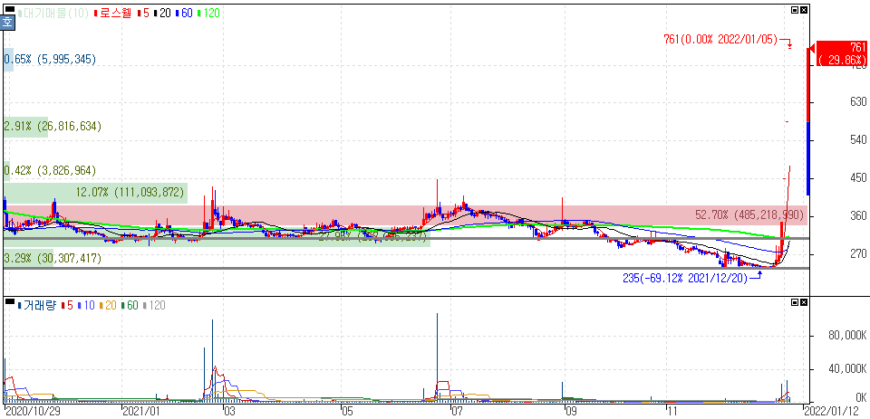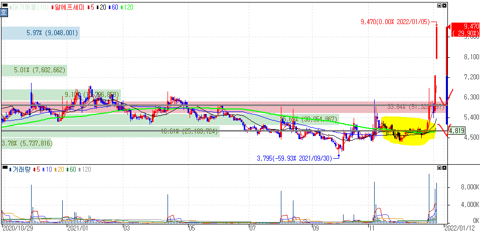 어제도 말씀드렸다시피 이번 코로나19 바이러스 사멸 램프만 아니라, MLCC, 반도체, 로봇 등 연결해 볼 수 있는 종목입니다. 개인적으로도 다뤘던 종목인데 어제·오늘 상한가를 기록하면서 당초 80%가 넘는 흐름입니다. 위 차트에서 노란 구간에서 어떻게 매수를 할 수 있었을지 복기해보시는 것도 좋습니다.
