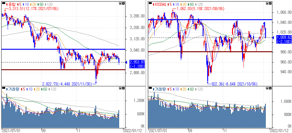 금일 코스피 지수는 -1.18% 하락한 2,953.97에 마감하였고, 코스닥 지수는 -2.14% 하락한 1,009.62에 마감하였습니다. 미국 금리와 환율 상승에 대한 우려 속 기관의 순매도에 하락하였습니다.