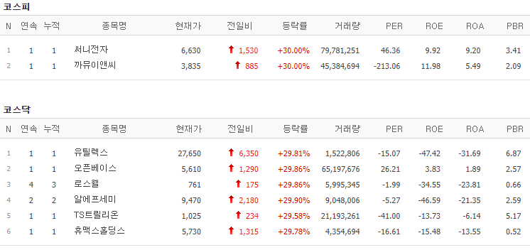 코스피에서는 써니전자, 까뮤이앤씨가 상한가를 기록했고, 코스닥에서는 유틸렉스, 오픈베이스, 로스웰, 알에프세미, TS트릴리온, 휴맥스홀딩스가 상한가를 기록했습니다.
