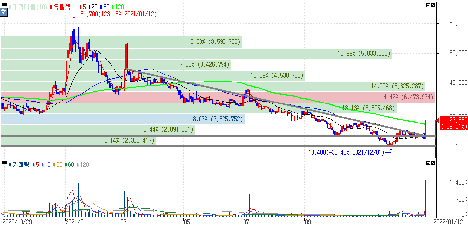 유틸렉스 주가는 지난해 초 고점 이후 줄곧 하락세를 이어져왔으나 수급을 비롯한 구간형성에 대한 초점을 맞춰 확인해 볼 수 있습니다.
