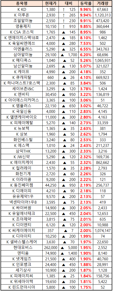 (종목명 앞에 'K'는 코스닥 종목을 의미합니다.)