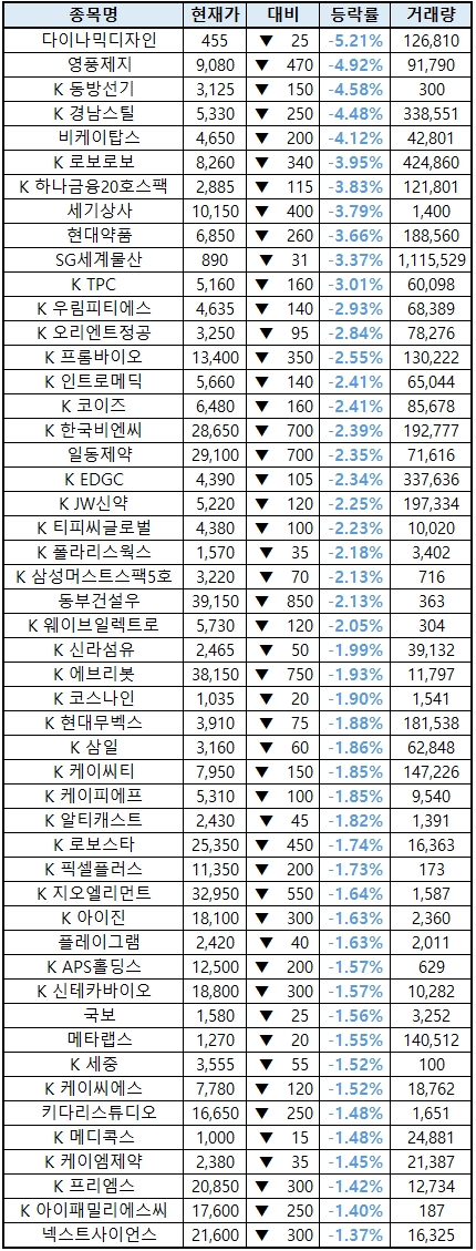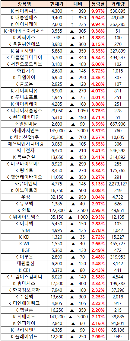 (종목명 앞에 'K'는 코스닥 종목을 의미합니다.)