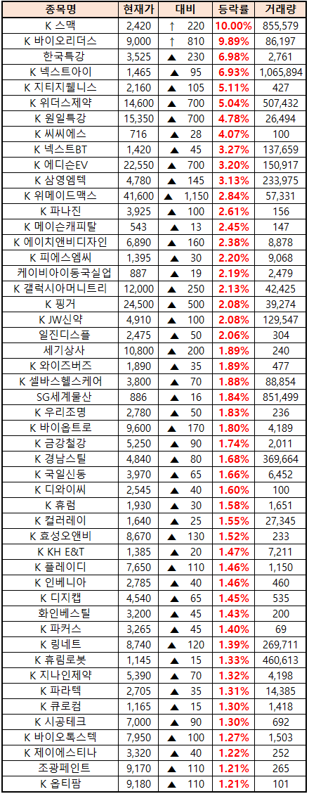 시간외 단일가매매 종가 종목 확인시 단순 급등주 등락률만 볼 것이 아니라, '거래량'에 따르는 거래대금도 판단하면서 보는 것이 중요합니다. (종목명 앞에 'K'는 코스닥 종목을 의미합니다.)