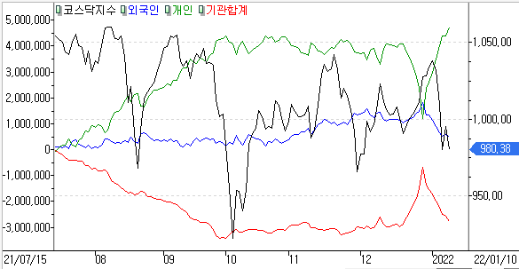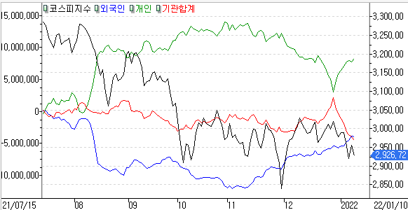 미국 증시의 부진한 고용지표 발표와 금리인상 기조가 지속되면서 외국인과 기관의 매도세가 주된 하락을 보이고 있습니다.