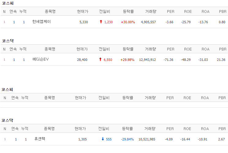 코스피에서는 한세엠케이가 상한가를 기록했고, 코스닥에서는 에디슨EV가 상한가를 기록했습니다. 반면 휴센텍이 하한가를 기록했습니다.