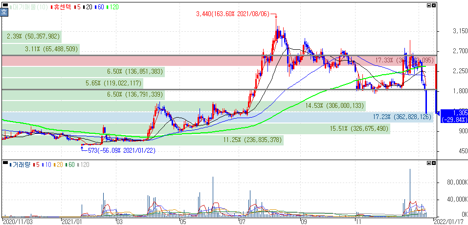 주요 경영진 70억원 규모 횡력행각 주장 제기되면서 하한가를 기록한 휴센텍 주가 입니다.