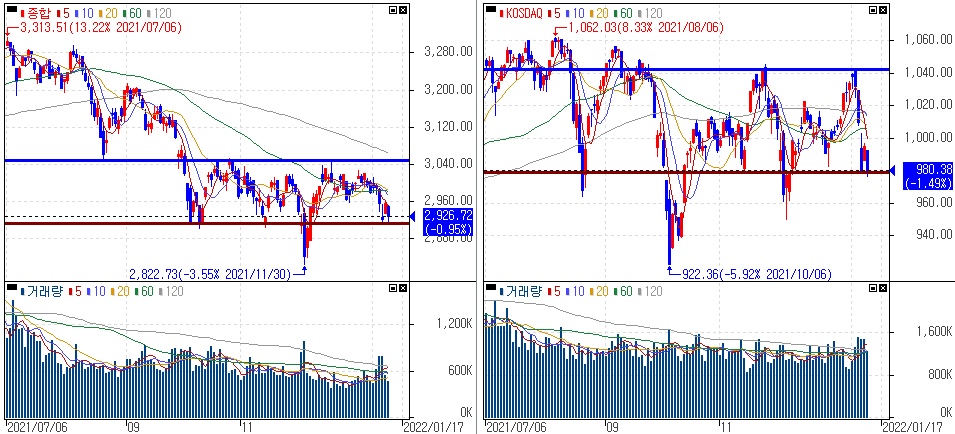 금일 코스피 지수는 -0.95% 하락한 2,926.72에 마감하였고, 코스닥 지수는 -1.49% 하락한 980.38에 마감하였습니다. 금리인상 기조 지속 속 부담이 확대되면서 하락을 보이며 마감하였습니다.