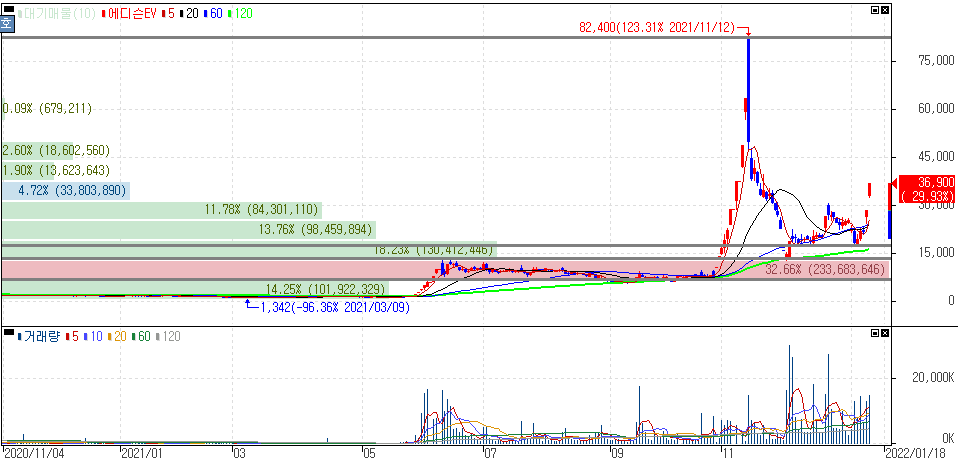 지난달까지 쌍용차 인수 불발 가능성까지 제기되면서 주가 등락을 보여주었는데 어제에 이어 연속 상한가를 기록한 에디슨EV 주가 입니다.