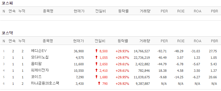 코스피에서는 상한가 종목이 없었고, 코스닥에서는 에디슨EV, 모다이노칩, 옵티팜, 피제이전자, 코이즈, 하나금융20호스팩이 상한가를 기록했습니다.