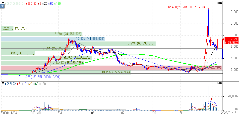 2차전지 양극재 소재 양산 부각 이력(6거래일 연속 상한가) 및 이재명 테마주 부각 이력 종목으로 상한가를 기록한 코이즈 주가 입니다.