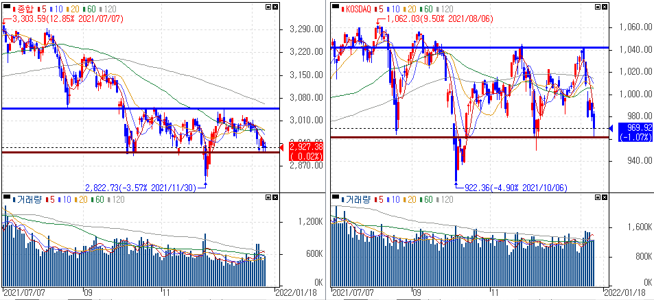 코스피는 여전히 지지구간에서 버텨주는 모습이 보여지고, 코스닥은 하락을 거듭하며 재차 지지구간을 확인해야 하는 상황이 연출되고 있습니다. 보통 반등을 보여줄 수 있는 구간이긴 하나 글로벌 증시 장세가 불안정한 흐름을 보여주기 때문에 현금비중을 지키키면서 안정적인 포지션을 유지해야 한다고 지난주부터 말씀드렸습니다.