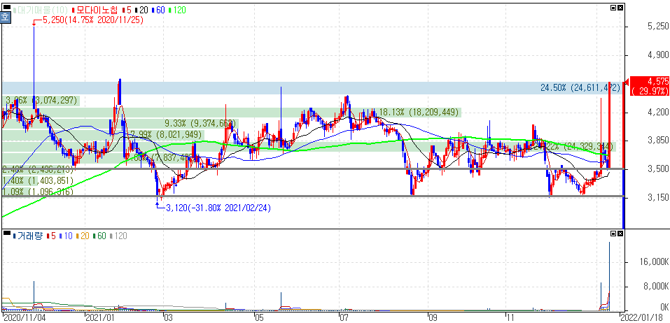 모다이노칩 주가 차트에서도 알 수 있듯이 지난 2020년 상승을 보인 이후 일정 가격대를 쭉 이어져오는 흐름을 보여왔습니다. 이 과정에서 중장기 추세전환 여부와 함께 수급의 움직임이 중요했다는 것을 알 수 있는 종목인 만큼 공부하시는 분들은 복기하시면 도움이 될 것입니다.