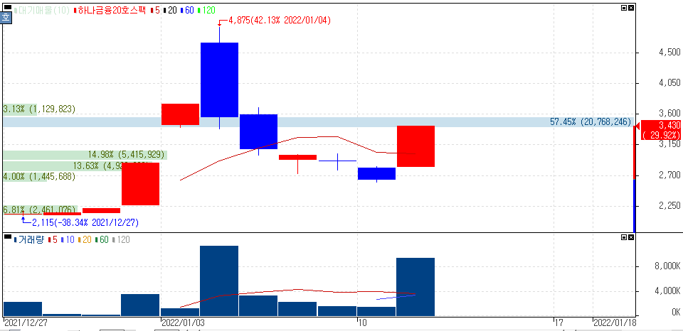 일부 스팩주 상승 속 상한가를 기록한 하나금융20호스팩 주가 입니다.