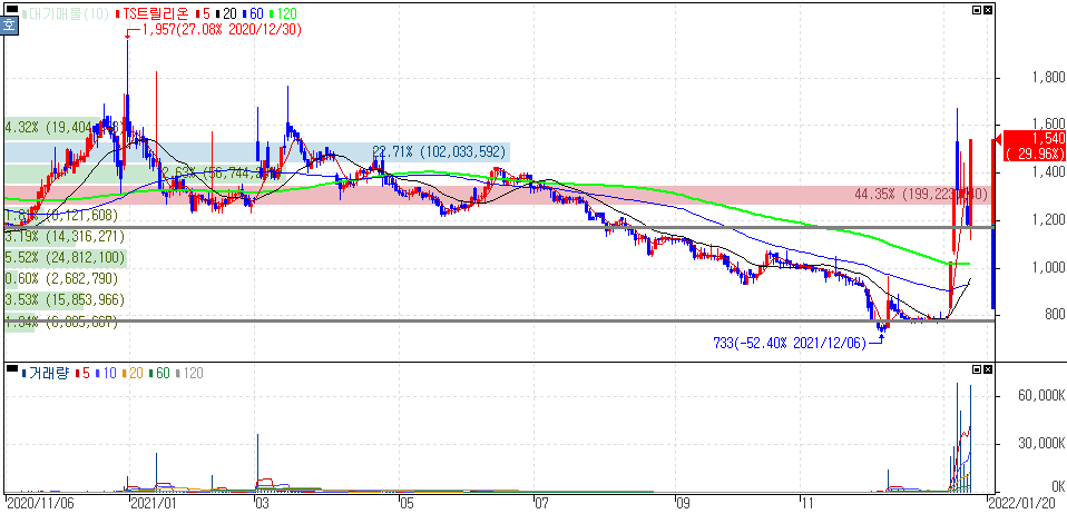 이재명 대선 후보, 4자 가상대결 1위 소식 등에 일부 관련주 상승 속 상한가를 기록한 TS트릴리온 주가 입니다.