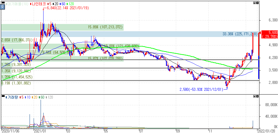 LG에너지솔루션 수요예측 흥행 소식에 관련주로 부각되면서 상한가를 기록한 나인테크 주가 입니다.