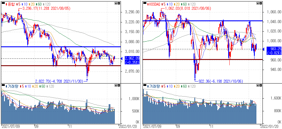 금일 코스피 지수는 -0.35% 하락한 2,962.09에 마감하였고, 코스닥 지수는 -0.82% 하락한 983.25에 마감하였습니다. 오미크론 확산과 미국 경제 지표 발표 일정을 앞두고 하락을 보였습니다.