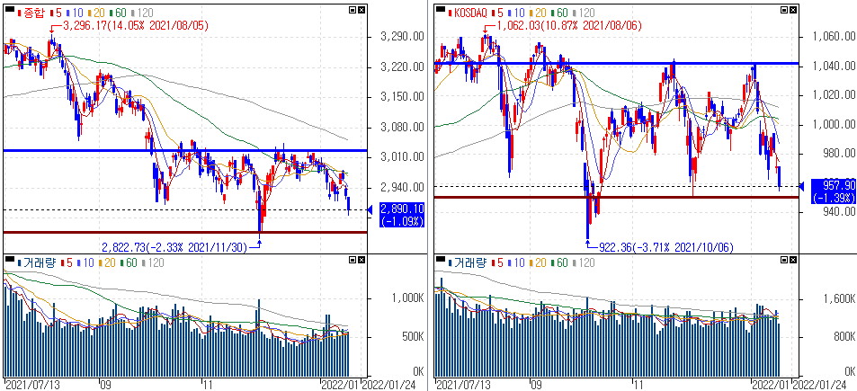 금일 코스피 지수는 -1.09% 하락한 2,890.10에 마감하였고, 코스닥 지수는 -1.39% 하락한 957.90에 마감하였습니다. 미국 및 중국 소매판매 지표 충격 영향 속 외국인과 기관의 동반 매도세에 하락을 보였습니다.