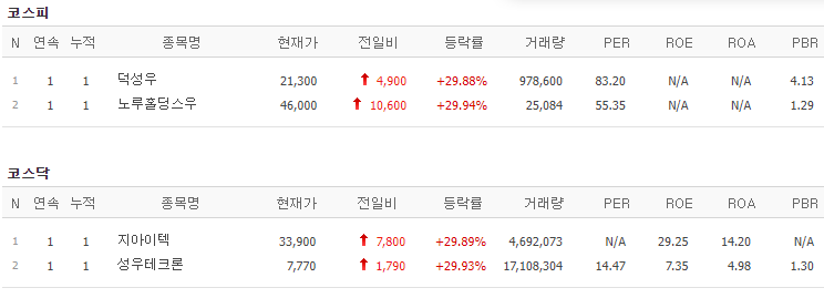 코스피에서는 덕성우, 노루홀딩스우가 상한가를 기록했고, 코스닥에서는 지아이텍, 성우테크론이 상한가를 기록했습니다.