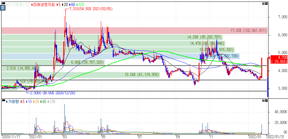 또한 국내 밥상물가 상승률이 10년만에 최고치를 기록하면서 곡물, 농업, 비료(사료) 등의 종목들도 동반 상승세를 보였습니다. 미래자원생명은 지난해 상반기 급격한 상승을 보인 이후 시세가 많이 약해진 모습을 보이면서 과거에 형성됐던 지지구간에서 주가 모멘텀이 출현해 강한 반등을 보였습니다.