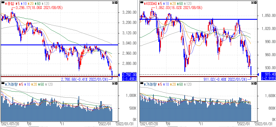 금일 코스피 지수는 -1.49% 하락한 2,792.00에 마감하였고, 코스닥 지수는 -2.91% 하락한 915.40에 마감하였습니다. 美 FOMC 앞두고 Fed의 통화긴축 불안감에 하락폭을 보였습니다.
