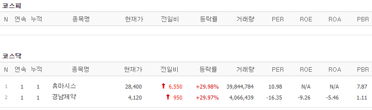 코스피에서는 상한가 종목이 없었고, 코스닥에서는 휴마시스, 경남제약이 상한가를 기록했습니다.