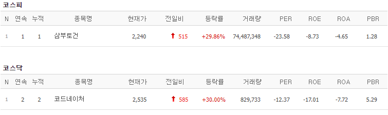 코스피에서는 삼부토건이 상한가를 기록했고, 코스닥에서는 코드네이처가 상한가를 기록했습니다.