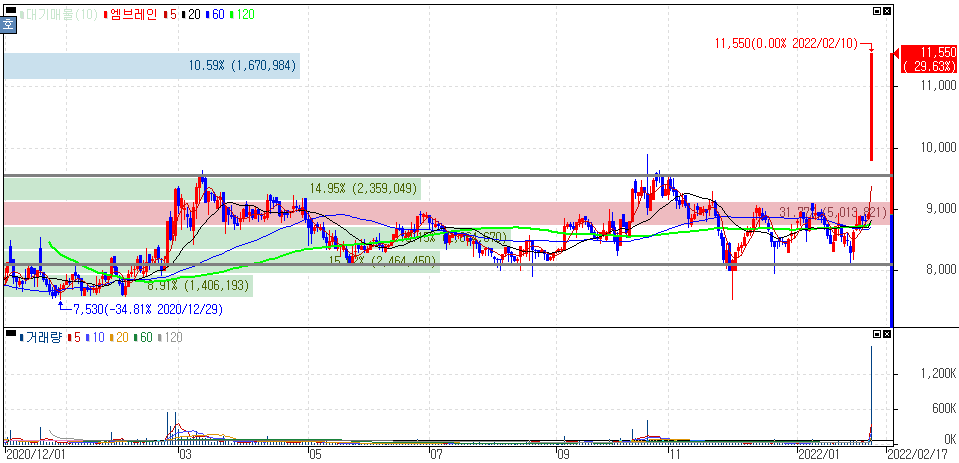 주당 1주 무상증자 결정 속 상한가를 기록한 엠브레인 주가 입니다.