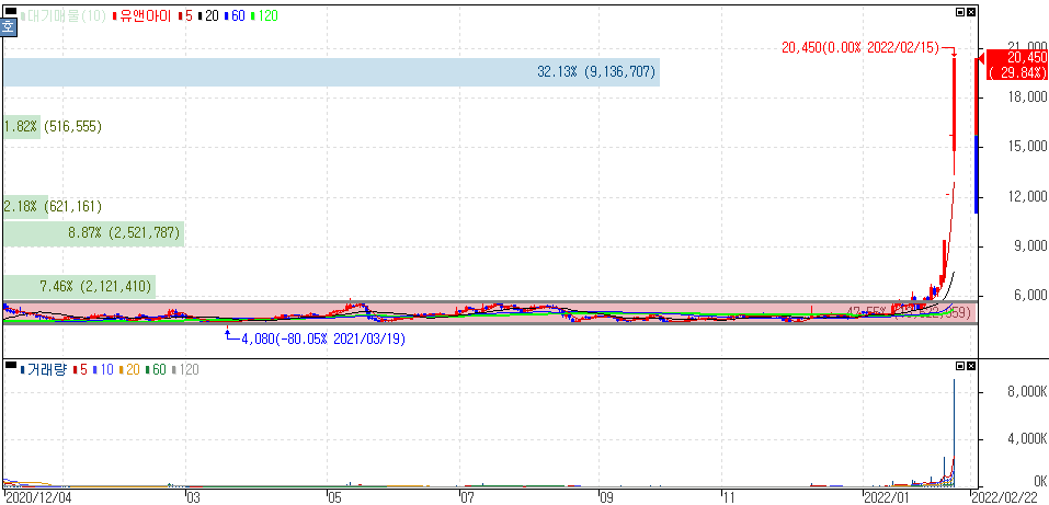 과거 삼성중공우나 에디슨EV 등의 종목처럼 가파른 급등세가 보일거라 했는데 다를 것 없이 연속 상한가를 보여주고 있습니다. 그럼에도 언제 반전이 나올 수 있을진 모르죠.