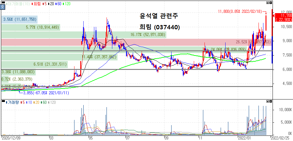 하락세 속에서 단기적인 주가 등락률을 보여줬던 것도 볼 수 있는데 최근 부각을 보이는 윤석열 관련주 종목들은 중장기 추세선 기준으로 등락을 보인다는 점도 확인해 볼 수 있습니다.